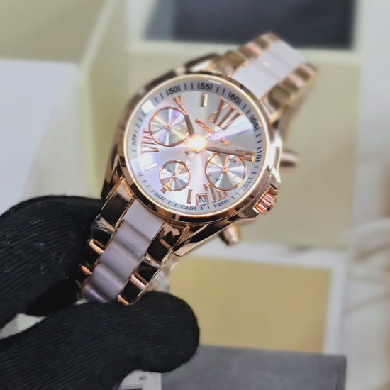 Elevate your everyday style with the Michael Kors Bradshaw Chronograph Women’s Watch (MK5907) – a perfect blend of modern elegance and sporty functionality. Designed for outgoing and active women, this luxury timepiece combines a sleek white ceramic finish with rose gold stainless steel, making it a must-have accessory for any occasion.